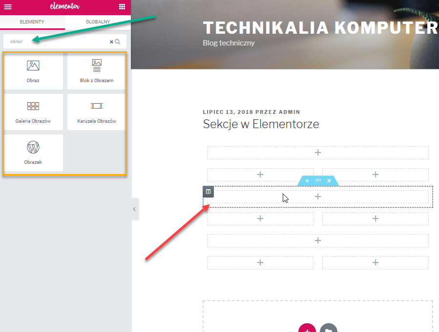 Wytłumaczmy, co się stało. Kliknąłem znak plusa w sekcji (czerwona strzałka), w polu wyszukiwarki wpisałem słowo obraz (niebieska strzałka), a na liście ukazały się wyłącznie widżety z tym słowem w nazwie (żółta obwódka).