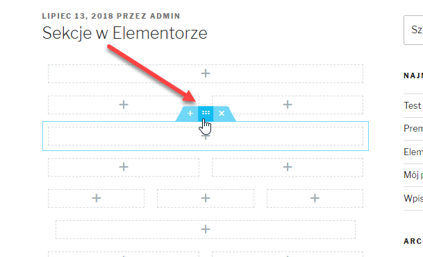 Gdy klikniesz środkowe, w panelu Elementora zobaczysz definicję sekcji i będziesz mógł ją zmienić. A co więcej, uchwycenie myszą tego środkowego przycisku pozwoli przeciągnąć sekcję w górę lub w dół – ukazuje się wtedy niebieski pasek, który pokazuje aktualną pozycję sekcji.